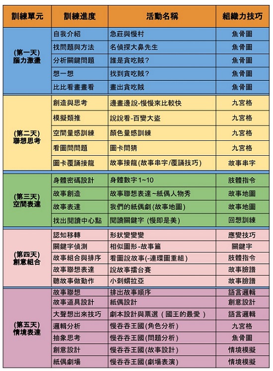 聽覺理解力、視覺觀察力、敘述表達能力、肢體語言表達、創造聯想、創意設計、創意表達、空間思考能力、故事表達技巧